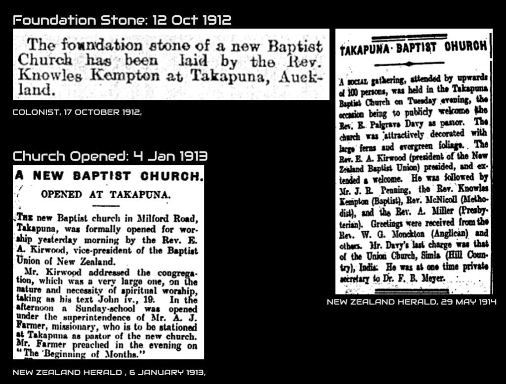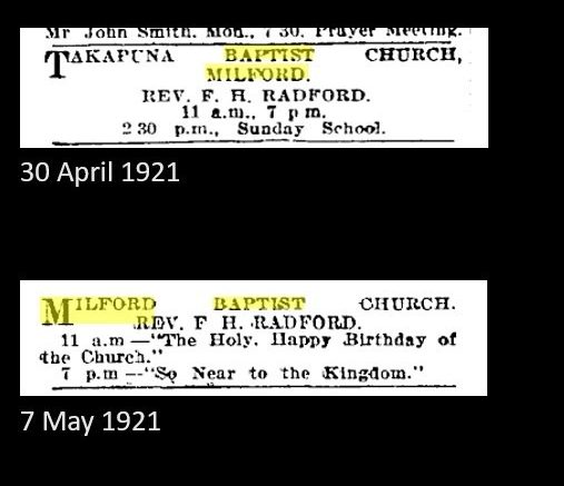The church was initially under the auspices of the Auckland Baptist Auxilliary, but in July 1921 joined the Baptist Union, having, as these advertisements from the Auckland Star Newspaper show, changed the name of the church to Milford Baptist Church probably around 1 May 1921.