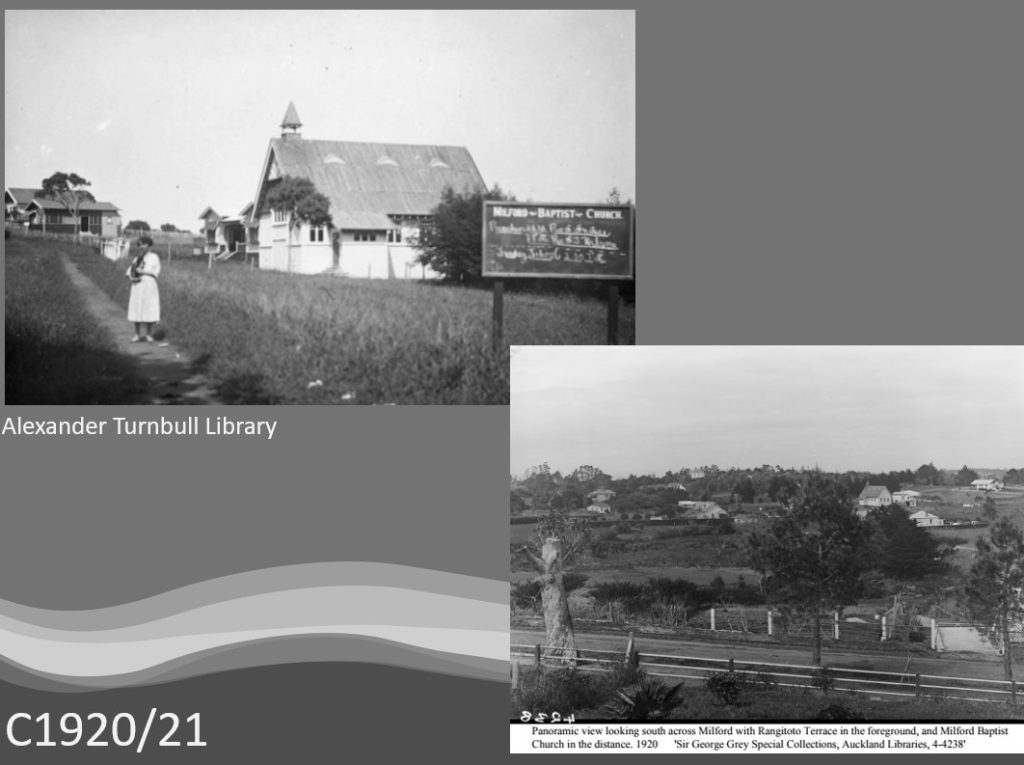 In October 1912 the foundation stone was laid of what was then called the Takapuna Baptist Church on a section of land donated by Mr Rushbrook, a benefactor of a number of non-conformist charities in Auckland. In just a few short months the church, built by Mr John Ashby who had arrived into Milford from England in 1908, was opened on January 4th 1913. You will notice that it is an isolated open area with minimal vegetation.